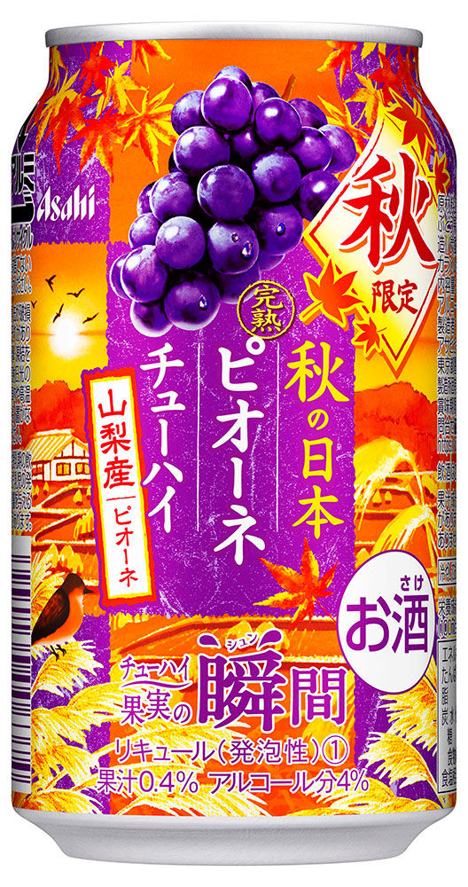 <山梨産完熟ピオーネ>は、山梨県産ピオーネの果汁を使用した缶チューハイです。秋に旬を迎える「ピオーネ」の華やかな香りと、果実由来の甘さをお楽しみいただけます。
