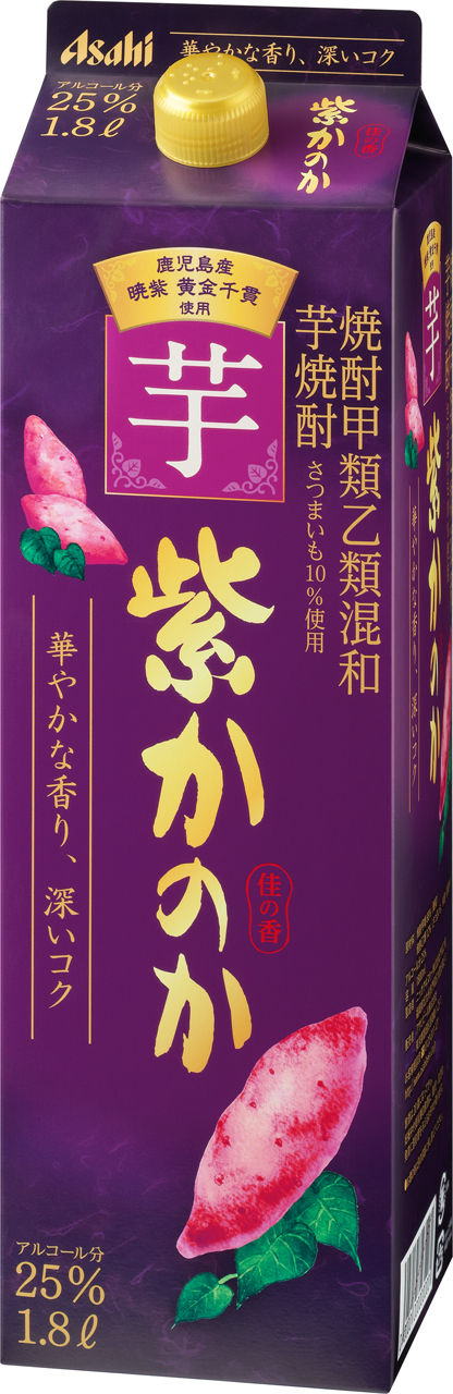 「紫かのか」は希少な紫芋「暁紫(アケムラサキ)」を原料に使用した芋焼酎。「暁紫」は濃い紫色の芋で上品な甘さとフルーティな香りが特長。生産量は日本で栽培されるさつまいも総生産量の0・1%にも満たず、大変希少な品種。焼酎乙類の原料には鹿児島県産の「暁紫」を主体に、鹿児島県産の「黄金千貫」を一部使用。焼酎甲類を調和させることで上品な甘さと、芳醇でコク深い味わい、スッキリとした後味に仕上げた。焼酎甲類88%(糖蜜)、焼酎乙類12%使用。
