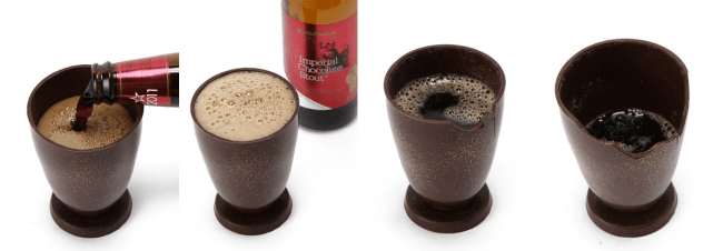 チョコレートグラスはチョコビールを注いで飲めるだけではなく、チョコビールを飲みながらグラスを一緒に食べることが出来る。