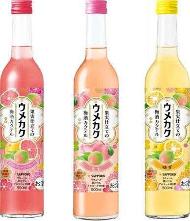 同時に、好評販売中の「ウメカク 果実仕立ての梅酒カクテル ゆず」は、パッケージのリニューアルを、さらに「ウメカク 果実仕立ての梅酒カクテル ピンクグレープフルーツ」「ウメカク果実仕立ての梅酒カクテル もも」は、中味・パッケージともにリニューアルした。