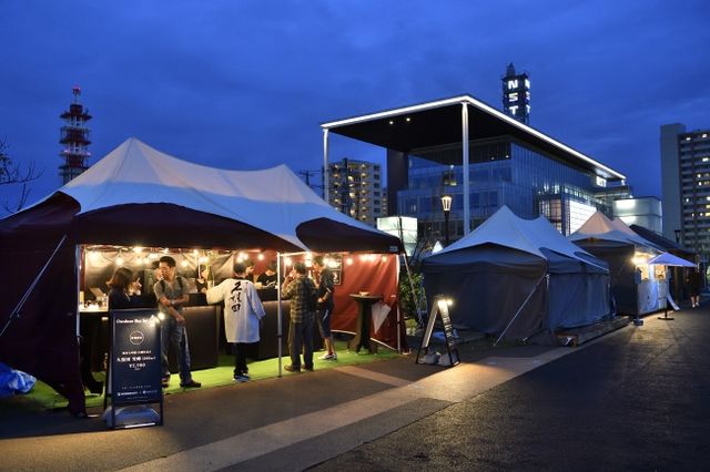 「Outdoor Bar by 久保田」では今年4月発売の「爽醸 久保田 雪峰」との飲み比べや、特製おつまみなども提供。19時からは焚火ラウンジも楽しめます。「やすらぎ堤」は6月29日~9月29日まで展開(www.snowpeak.co.jp/sp/mizbeoutdoorlounge/)。