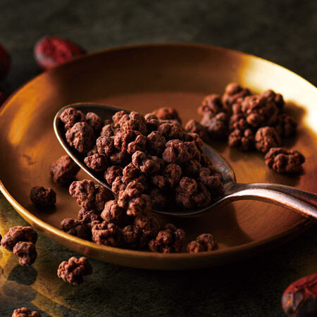 キャンディング(飴がけ)したカカオニブにビターなチョコレートをコーティング。カリカリとしたニブの食感とほろ苦い味わいが広がります。