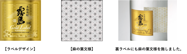 「ゴールドラベル霧島」の名に相応しい金色に輝くラベルで、華やかな味わいを表現し、上質で立体感のあるデザインにするため、ニス加工を施しています。使用している酵母名「ミヤマキリシマ花酵母」をアルファベットで表記し、ミヤマキリシマの花もラベルデザインに配しました。日本の伝統模様で古くから親しまれている「麻の葉文様」をラベルの背景に施し、モダンで華やかな印象と味わいがリンクしたデザインに仕上げています。