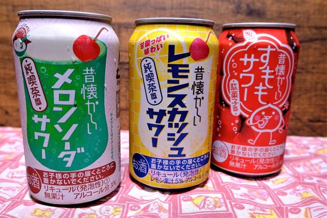 今回の「昔懐かしい」シリーズ、「昔懐かしいレモンスカッシュサワー」「メロンソーダサワー」「すももサワー」3種類グラスに入れて並べると黄色・緑・赤と色がきれい。
