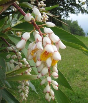 月桃(げっとう)は、沖縄や奄美大島、台湾などの温暖な地域に群生するショウガ科の植物。どこか懐かしさを感じさせる爽やかな香りと、緑色の大きな葉が特長です。毎年4~6月頃には白く可憐なつぼみを付け、その後ランに似た黄色の花を咲かせます。葉から漂う爽やかでやさしくフローラルな香りが特長。